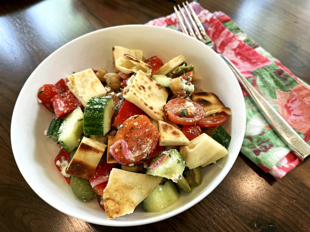 Lidey’s original version: Lidey uses an 8oz block of halloumi cheese, patted dry and cut into ¾-inch-thick slices. She puts the halloumi slices on a small plate and drizzles with 1 Tbsp olive oil and cooks them in the skillet over medium high heat until golden brown, 2 to 3 minutes per side. She transfers to a cutting board and cuts the slices into bite-size cubes, that you toss onto the salad with the naan/pita.