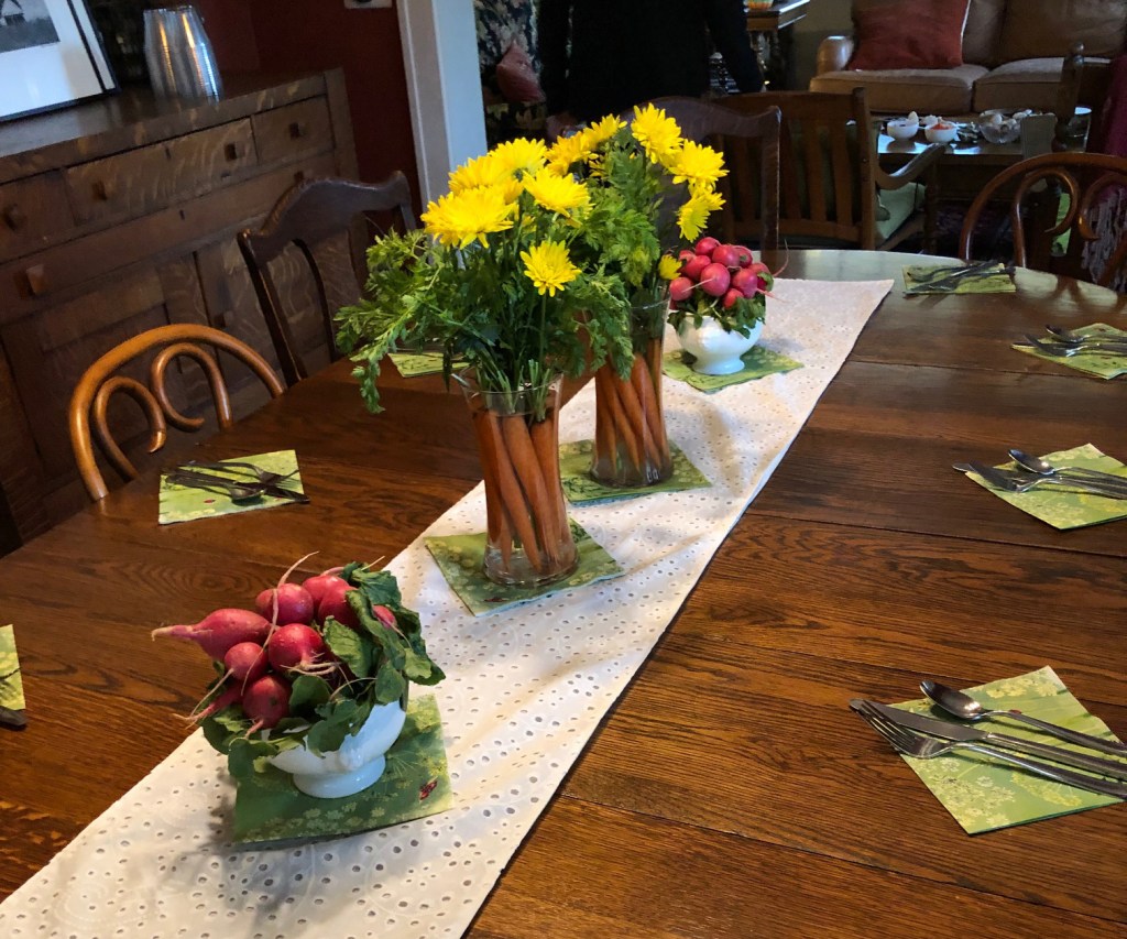 I love the idea of using carrots with green tops in a flower arrangement, so I bought a couple of bunches of carrots, some gorgeous radishes and some bright mums. Assembly was simple and our guests seemed to get a kick out of them.